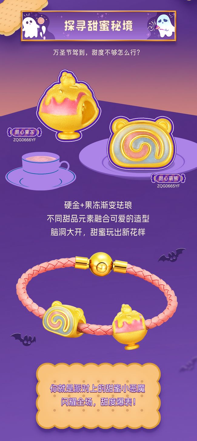 万圣节驾到,在“不给糖就捣乱”的狂欢节日里,甜度不够怎么行?周大生珠宝·腕美系列“甜心果冻”“甜心萌熊”因而甜蜜来袭。周大生将不同的甜品元素融合可爱萌趣的造型设计,脑洞大开玩出甜蜜新花样。果冻渐变珐琅的加持,玩转多巴胺配色,让炫彩缤纷的你甜度爆表,成为狂欢人群中最闪耀的存在。